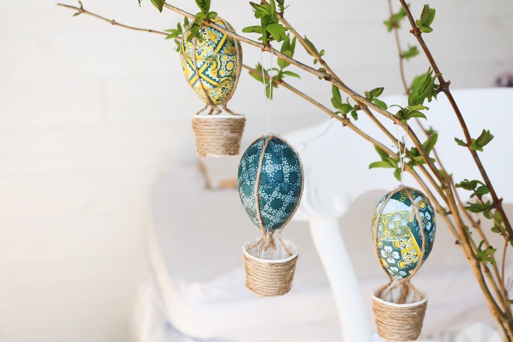 Dessa godbitar kan se lite krångliga ut. Men grunden är bara urblåsta ägg, jutesnöre och ketchupkoppar från ditt närmaste snabbmatsställe. Om du vill dekorera dem kan du köpa decoupagepapper och lack, klistra på servettens första lager eller måla med färgpennor. Blommor i olika varianter, minimalistiskt linjer eller gå helt på känsla – ditt påskris kommer garanterat vara unikt. Ställ vasen i fönstret för se dina luftballonger komma till liv i den friska vårvinden.