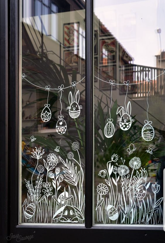 Att måla fönsterna med filmjölk har du säkerligen hört och sett förut. Men vad tror du om att inspireras av insynsskydden som finns i plast? Blommor, små grässtrån och grenar som klättrar upp ger vårkänslor och en egen touch – vi älskar det! Det finns mallar och stansar att köpa på hobbyaffärer för att förenkla processen. Maskeringstejp är alltid en räddare när det kommer till att måla sina fönster, då får du till skarpa linjer och får mer kontroll på filen.